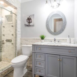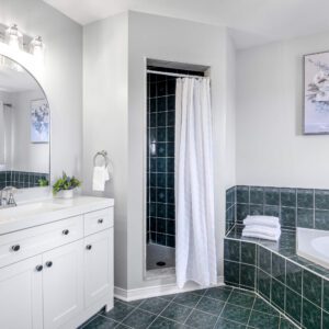 • Updated spa-like bathroom with marble finishes & shower jets